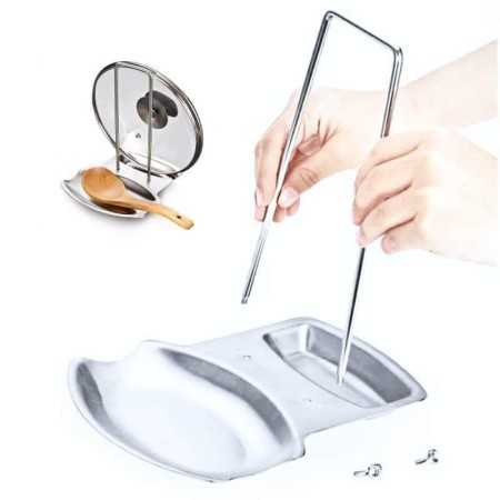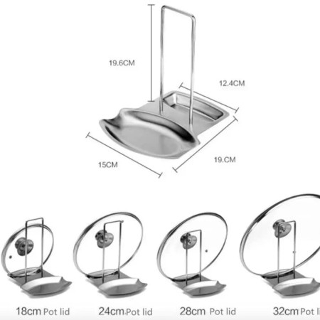 Stainless Steel Pan Pot Rack Cover Lid Holder Spoon Stand. Standing pot & pan lid rack Material: High Quality Stainless Steel Color: Silver Size : 19 x18.5 x 15.5 CM